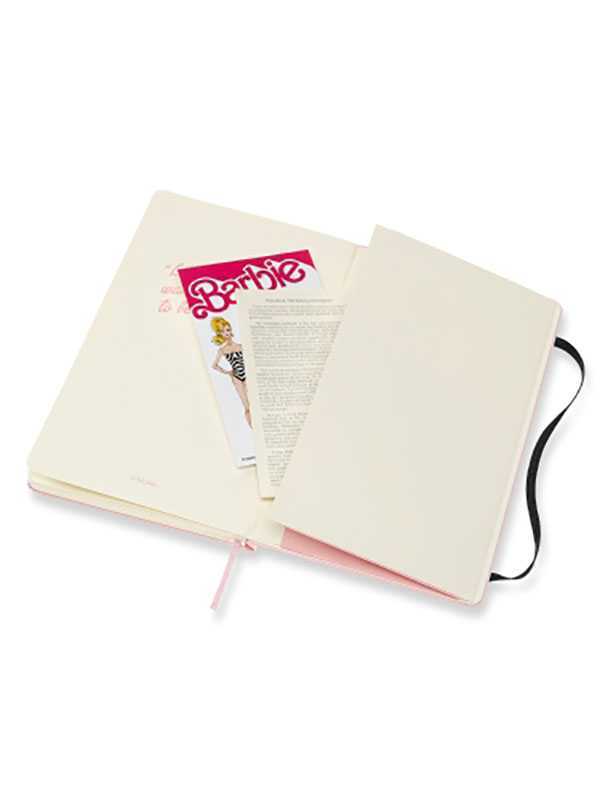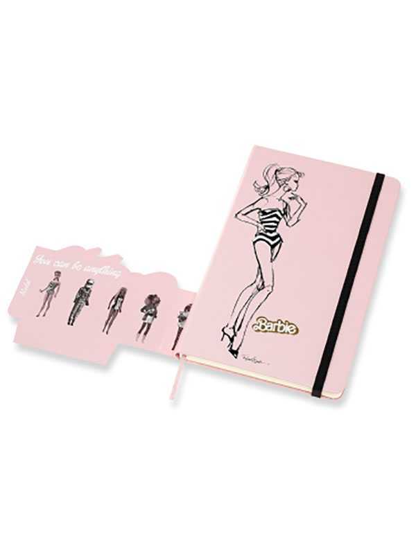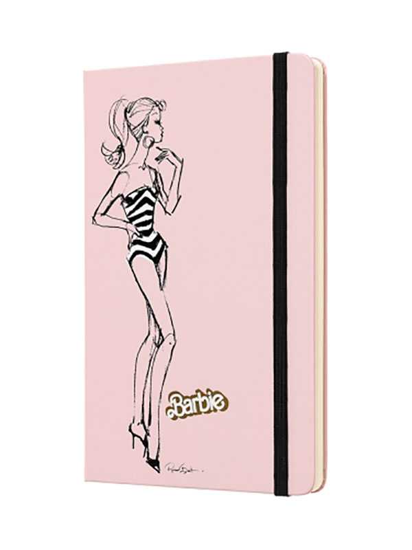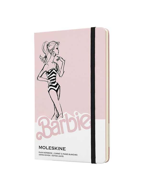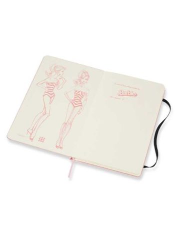 Barbie represents a world of make-believe and imagination: she is a blank page onto which generations have sketched out their dreams and re-written their past. She first hit the scene 1959, dressed in the black and white chevron swimsuit that features on the cover of this Barbie Limited Edition Notebook. This original sketch of the doll along with the instantly-recognizable Barbie logo in delicate pink ensure that your notes stand out from the crowd in style. While the cover of this large Limited Edition Barbie Notebook celebrates the doll in her very first outfit, the plain pages inside make space for you to fashion your own ideas and ambitions. A contrasting black elastic closure secures the inner pages, the bookmark ribbon makes sure you’re always in the right place, and the expandable back pocket is tailored to fit loose notes. Part of a wider Barbie Capsule Collection for Moleskine, fans can express themselves with a choice of 4 Limited Edition notebooks, an iPhone cover and 9999 special boxed and numbered Collector’s Editions, each one decorated with vintage Barbie illustrations and containing a Limited Edition Notebook and pen.
