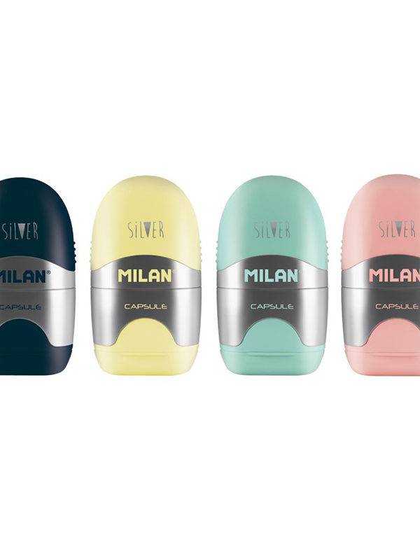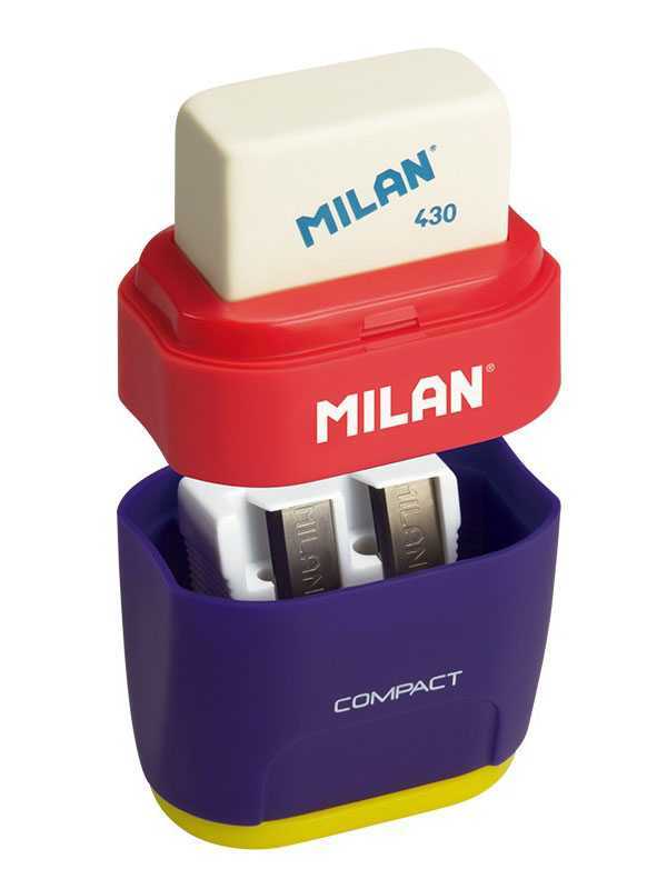 Combination eraser and double pencil sharpener (standard and MAXI sizes). The pencil sharpener has a sharp and resistant carbon steel blade which makes it ideal for all varieties of pencils. It also has a safety blade system which prevents the blade from becoming detached from the body of the pencil sharpener. Ideal for school use. Designed in Spain by MILAN’s own R+D department. Available in assorted colours: red, green, yellow, blue.