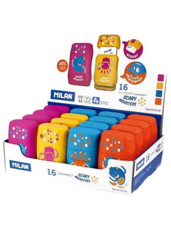 Combination eraser and double pencil sharpener (standard and MAXI sizes). The pencil sharpener has a sharp and resistant carbon steel blade which makes it ideal for all varieties of pencils. It also has a safety blade system which prevents the blade from becoming detached from the body of the pencil sharpener. Ideal for school use. Designed in Spain by MILAN’s own R+D department. Available in assorted colours: pink, yellow, blue, orange.