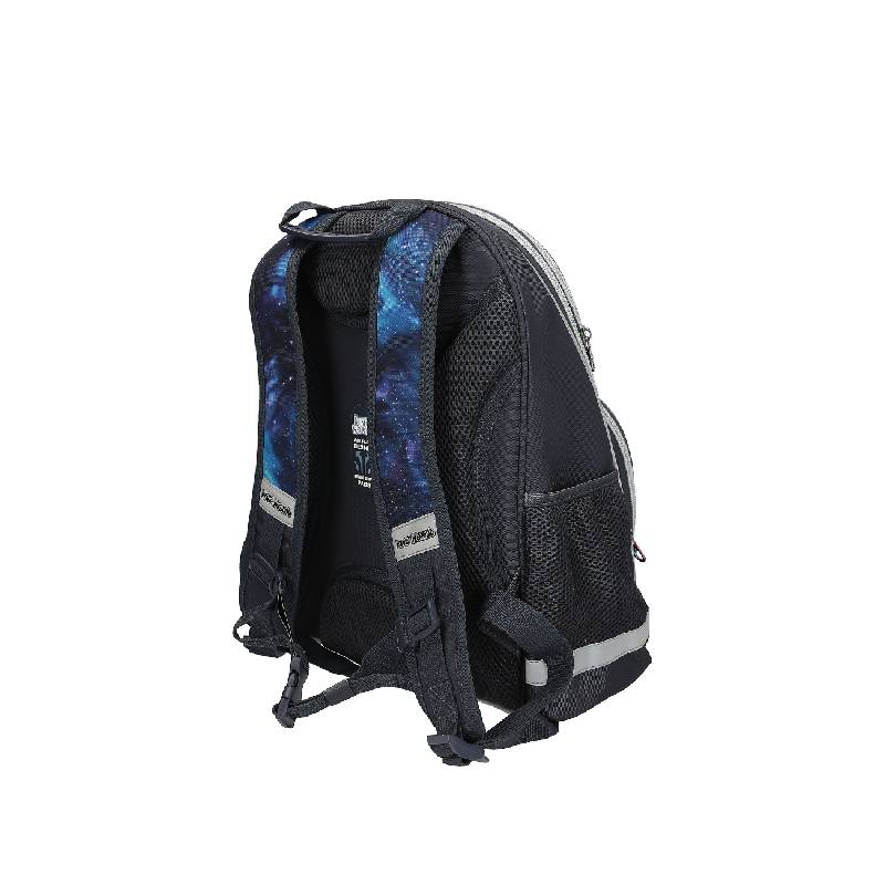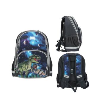 Galactically cool: The dark blue school rucksack from Dino World has a dangerous and ingenious motif on the front with two T-rexes against a spacey background. The large main compartment has two pockets. The upper front pocket has several small pockets and a zip compartment.