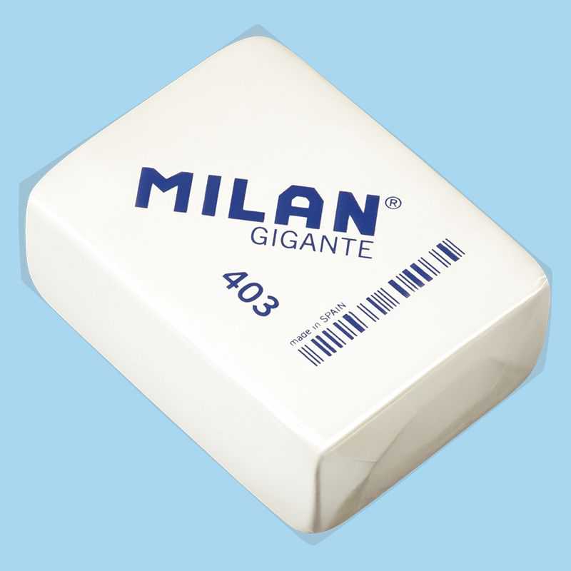 Soft synthetic rubber eraser. Can be used to erase a wide range of graphite pencil strokes from all types of paper. Individually wrapped. The largest MILAN eraser. Size of eraser: 6.8 x 5.1 x 2.8 cm.