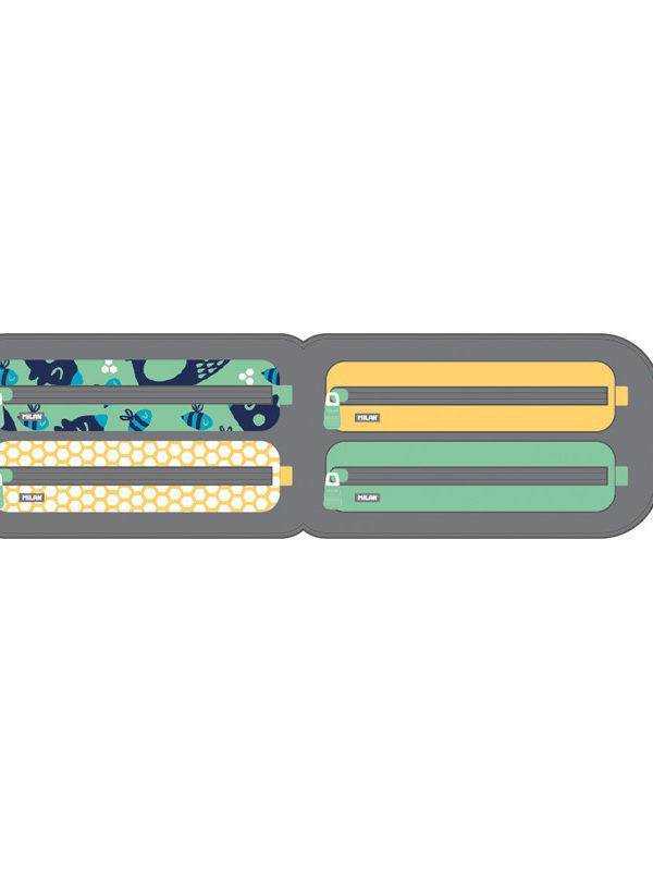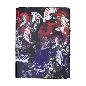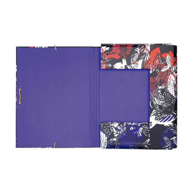 Hardcover folder. Can hold folio and A4 paper (33.5 x 26 cm) with a thickness of 3 cm, equivalent to approximately 200 sheets. Matte finish with Jungle print that matches the collection. Purple interior and yellow durable elastic band.