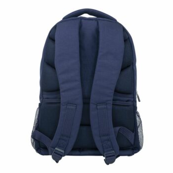 School backpack with 4 zips. 1918 series, navy blue colour. Inspired by the original colors and design of MILAN erasers. Main compartment with a protective laptop sleeve. 3 front compartments. 2 quick-access mesh side pockets. Adjustable straps, padded and breathable back, reinforced base and trolley sleeve. The front pocket includes a 430 eraser key ring on the zipper handle. Navy blue inner lining printed with a grid that evokes the shape of MILAN erasers. ‘Ripstop’ outer fabric: light and resistant to riping and tearing. It uses a special technique that weaves thick, reinforcement threads at regular intervals creating a crosspatch pattern.