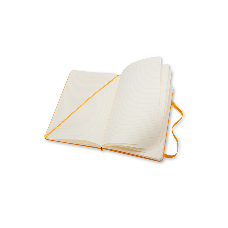 This orange version of the basic yet classic Ruled Large Notebook is a stylish travel companion, perfect for writing thoughts and sharing notes. Like its best-selling Black counterpart, it has a cardboard bound cover with rounded corners, acid-free paper, a bookmark, an elastic closure and an expandable inner pocket that contains the Moleskine history.
