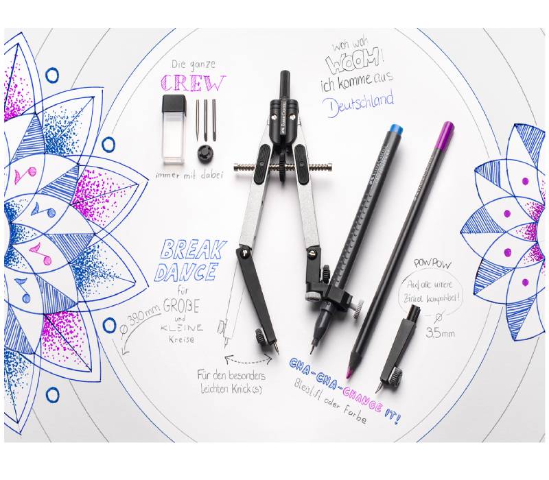 Quality and functionality combined with sophisticated design – this is the motto of the Faber-Castell company. Even with regard to compasses, the market leader keeps abreast of the latest trends. However, apart from trendy designs, Faber-Castell also offers rugged technology: Robust gear wheels, firm central wheel spindles, easily adjustable legs as well as non-slip needles and lead clamps for exact lines are standard features of all Faber-Castell compasses.