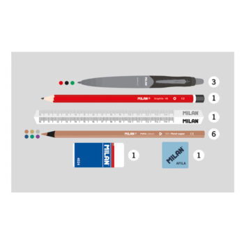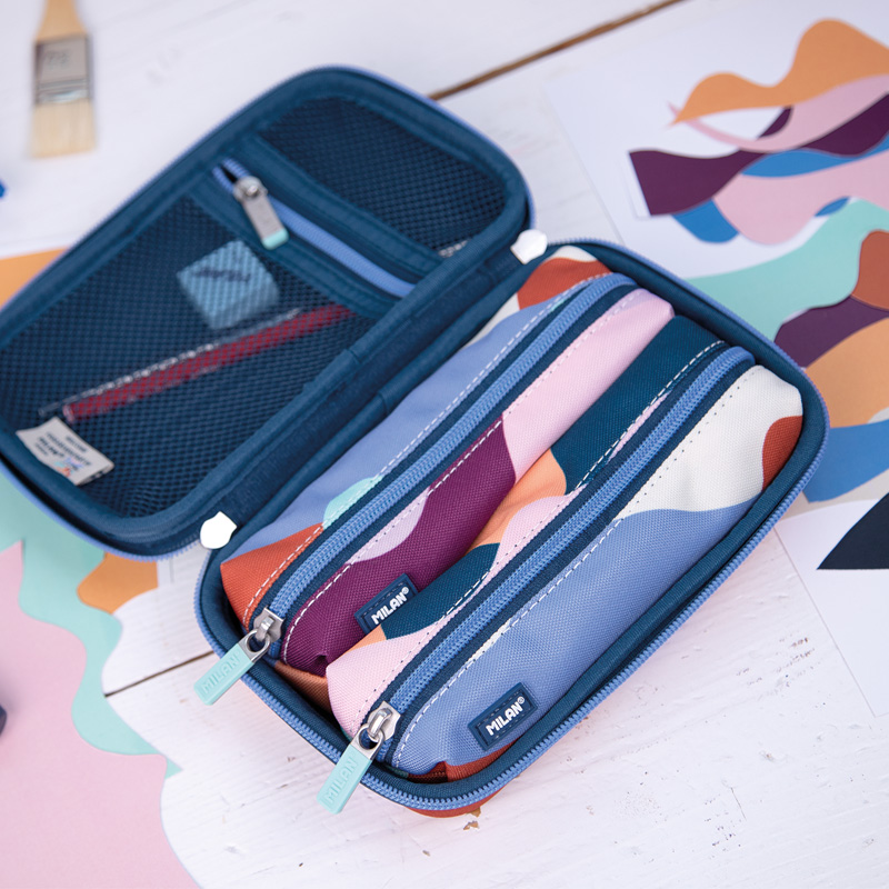 Semi-rigid kit with 2 filled pencil cases. The Fun series, multicolour. A collection inspired by the fun and enjoyment of the experience during the creative process. With a palette of unique colours, the several shapes of a collage become the pattern of this collection. With a mesh inner pocket and velvet lining interior to protect the contents from possible scratches. Content: 1 eraser 4024, 1 AFILA pencil sharpener, 1 HB graphite pencil,3 CAPSULE pens (black, green and red), 1 triangular ruler 15 cm and 6 black wood metallic colour pencils.