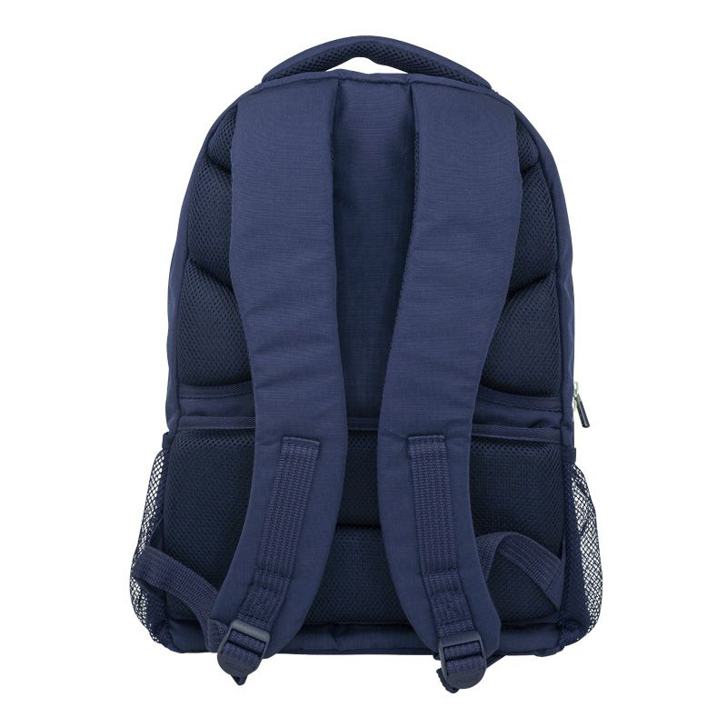 School backpack with 4 zips. 1918 series, navy blue colour. Inspired by the original colors and design of MILAN erasers. Main compartment with a protective laptop sleeve. 3 front compartments. 2 quick-access mesh side pockets. Adjustable straps, padded and breathable back, reinforced base and trolley sleeve. The front pocket includes a 430 eraser key ring on the zipper handle. Navy blue inner lining printed with a grid that evokes the shape of MILAN erasers. ‘Ripstop’ outer fabric: light and resistant to riping and tearing. It uses a special technique that weaves thick, reinforcement threads at regular intervals creating a crosspatch pattern. Fabric composition: polyester outer fabric and inner lining. Size: 46.5 x 30 x 17 cm.
