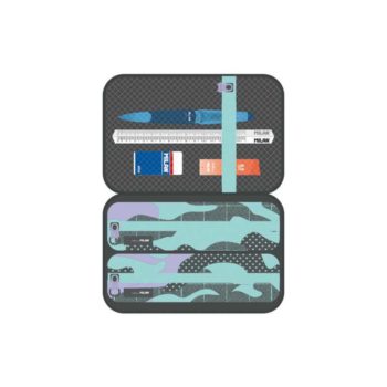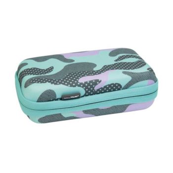 Semi-rigid kit with 2 filled pencil case. Turquoise Camouflage special series, colour turquoise and lilac. Content: 1 eraser 4024, 1 CAPSULE Slim 0.5 mechanical pencil, 1 box with 12 spare leads 0.5 mm HB, 4 CAPSULEUno pens (blue, black, red and green),one 15 cm ruler, 1 CAPSULE fluorescent yellow highlighter, 6 black wood coloured fluo pencils. Composition: E.V.A. and polyester exterior, polyester inside lining. Size: 21.5 x13.5 x 6.5 cm.