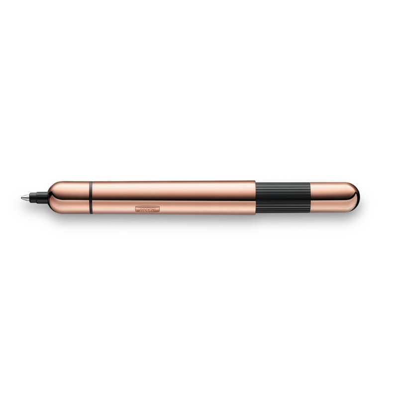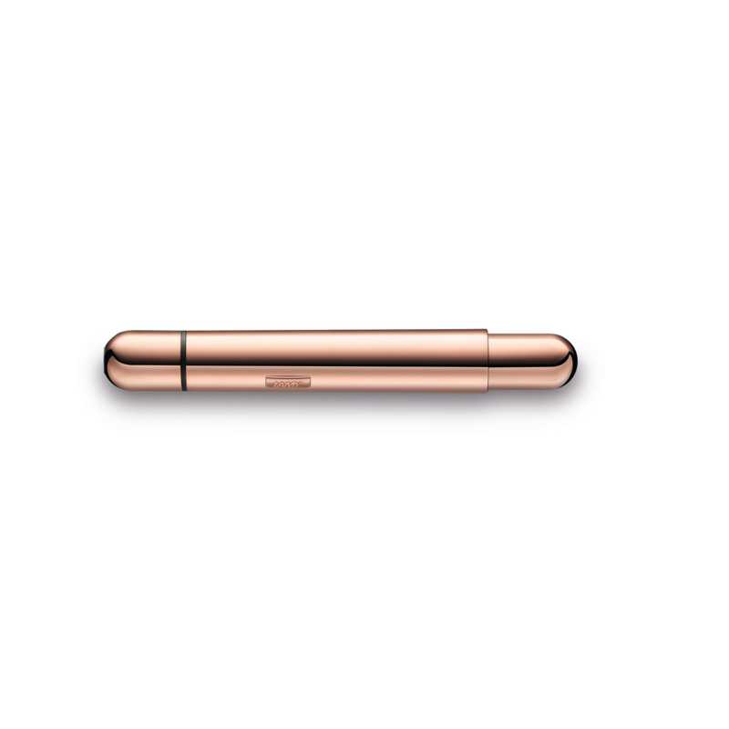 Special Edition 2020: LAMY pico Lx rosegold Set. Small and handy, the LAMY pico first shows its full potential when expanded. An innovative pocket pen which transforms to a full-grown ballpoint pen thanks to its sophisticated push mechanism. Available in a set LAMY pico Lx rosegold with black and shiny leather case in gift box. Pocket pen polished brass with compact refill LAMY M 22 M black.