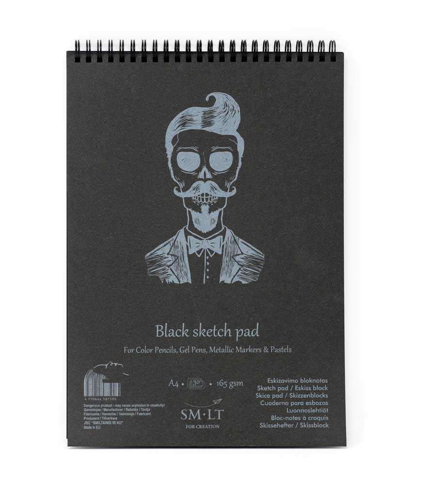 With black rough paper. The paper is suited for colored pencils, gel pens, metalic markers, pastels. With natural colored cardboard cover, hard back, microperforated sheets and spiral on top. Inside paper is Lignin free and FSC certified.