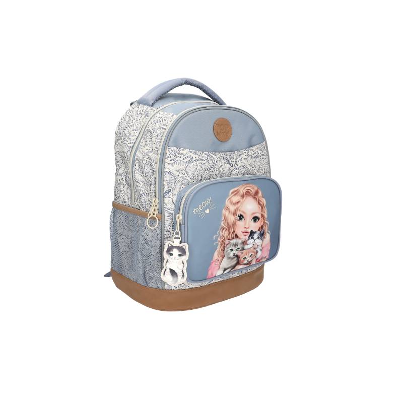 Cat Love: The light blue and cream-coloured school backpack from TOPModel has a large model motif with three kittens on the attached front pocket and a great all-over cat pattern all around. Cute plus: the cat pendant!