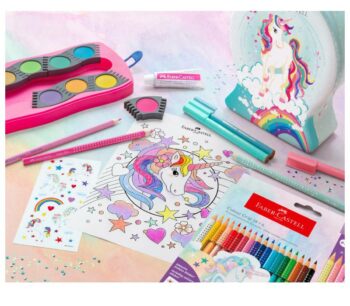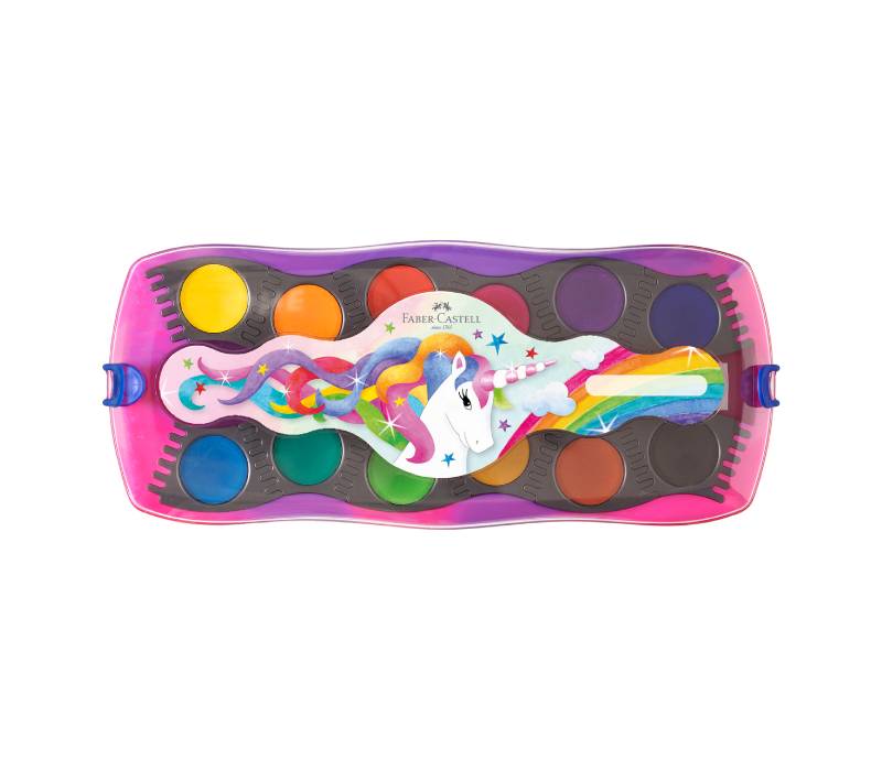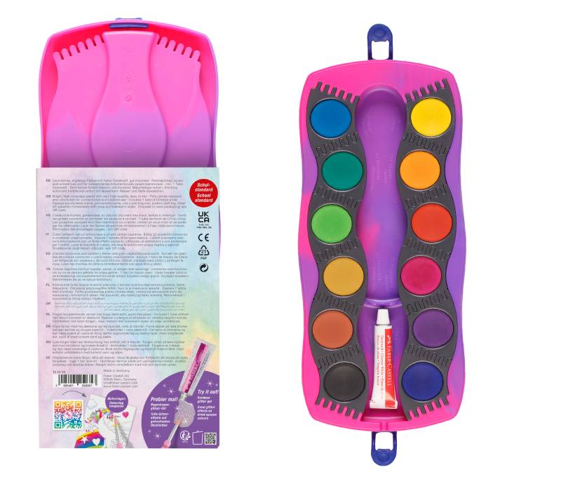 Add a touch of magic to every motif: inspired by the dazzling unicorn designs that fascinate kids so much right now, Faber-Castell has added rainbow glitter from the tube to the Connector paint box. Little artists who love unicorn glitter can use the colourful sparkle finish to decorate the tail or mane of their self-painted mythical creature – and, of course, to add a sparkle to any other scenery. For this purpose, the limited edition contains twelve bright, high-yield standard colours in the tried-and-tested pluggable individual pens and a tube with rainbow glitter. The colours can be easily mixed in the palette integrated in the lid.